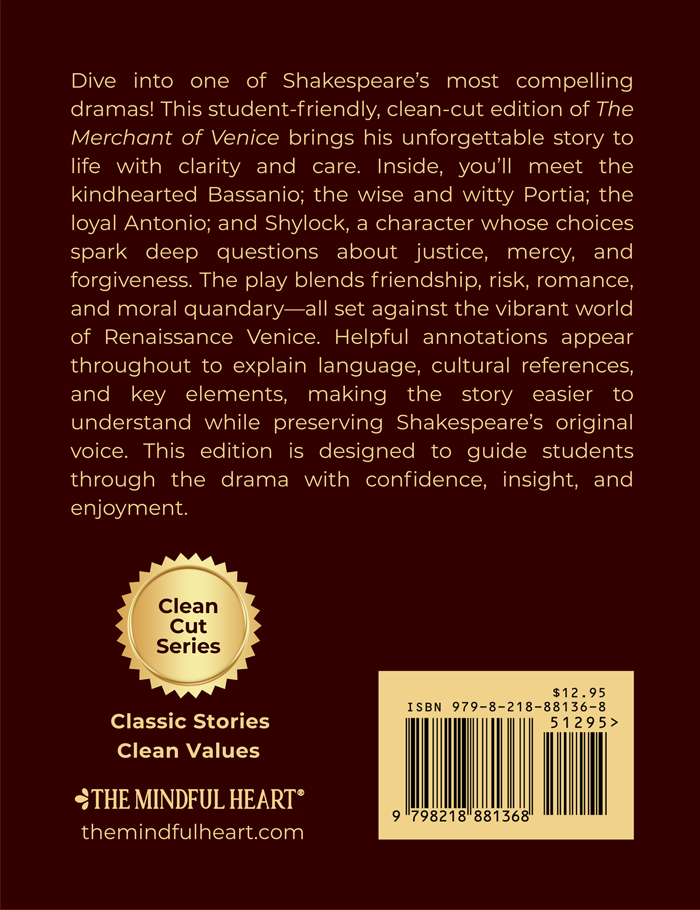 Dive into one of Shakespeare’s most compelling dramas! This student-friendly, clean-cut edition of The Merchant of Venice brings his unforgettable story to life with clarity and care. Inside, you’ll meet the kindhearted Bassanio; the wise and witty Portia; the loyal Antonio; and Shylock, a character whose choices spark deep questions about justice, mercy, and forgiveness. The play blends friendship, risk, romance, and moral quandary—all set against the vibrant world of Renaissance Venice. Helpful annotations appear throughout to explain language, cultural references, and key elements, making the story easier to understand while preserving Shakespeare’s original voice. This edition is designed to guide students through the drama with confidence, insight, and enjoyment.